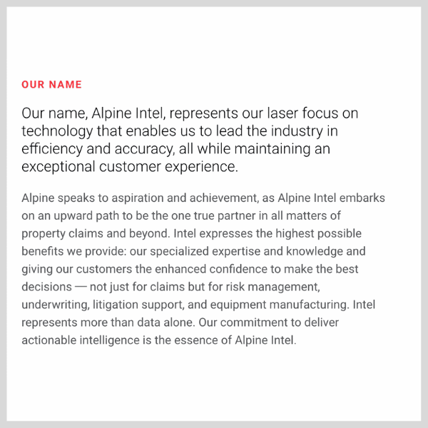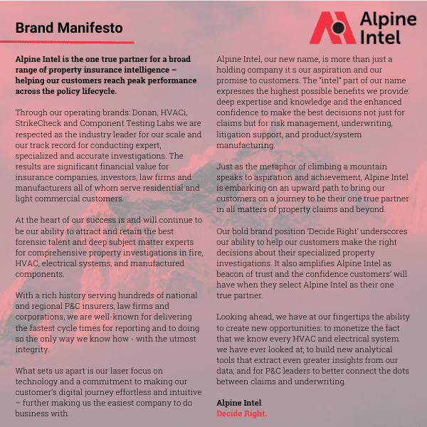 WANT Branding created a differentiated new Brand Strategy and Positioning ‘Decide Right’ which underscores the firm’s ability to help insurance adjusters and business leaders make the right decisions about critical property decisions. The positioning speaks to the highest-level benefit to customers: the ability to make faster, smarter and better decisions. A bold new visual treatment for the brand mark was created that echoed the aspirational idea behind the ‘Alpine’ part of the name and reinforced the visual cue of precision, which is a critical component of the brand’s engineering expertise. The chosen colors of red, black and white convey seriousness and stature and the design system allows for in inclusion of on-brand icons and infographics.