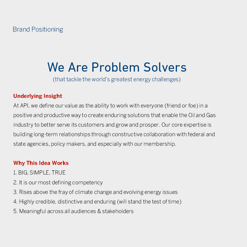 We collaborated extensively with API leadership and API’s Communications Committee, a working group comprised of twenty high-ranking members from some of the US’ biggest oil and gas companies. After several months of work and refinement, we finalized two big ideas – a new Brand Positioning ‘We are the problem solvers’. This bold, broad idea captured the most defining competency of API – as the leading organization helping to solve some of the biggest energy issues and challenges. This idea was universally meaningful to all audiences and stakeholders.