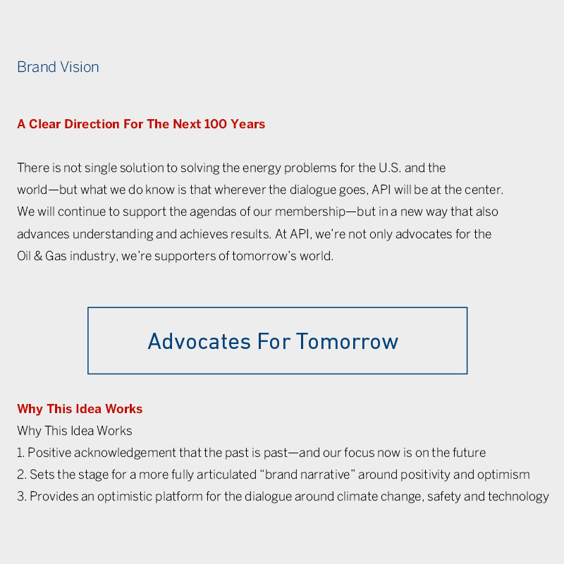 In parallel we agreed on a brand tagline ‘Advocates for tomorrow’ which could serve as a clarion call for the organization and its members for next 100 years. This bold tagline underscored API’s support of the agendas of its members in a way that could achieve results. This idea would not only underline API’s advocacy for the Oil & Gas industry, but also support its role in creating tomorrow’s world.