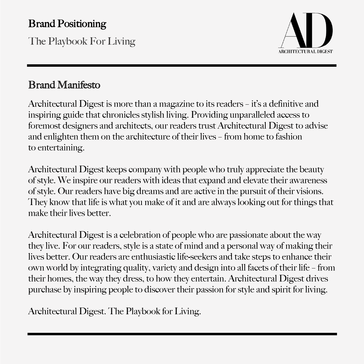 The third – and recommended – brand positioning idea ‘Playbook for living’ captured in a powerful and simple way, the notion of AD as the definitive ‘dream’ book that could direct and guide the essential aspects of how architecture and design unite to create living spaces. The biggest plus of this positioning idea was its ability to appeal broadly a wider class of audiences without alienating its core base of readers who have subscribed to AD for decades.