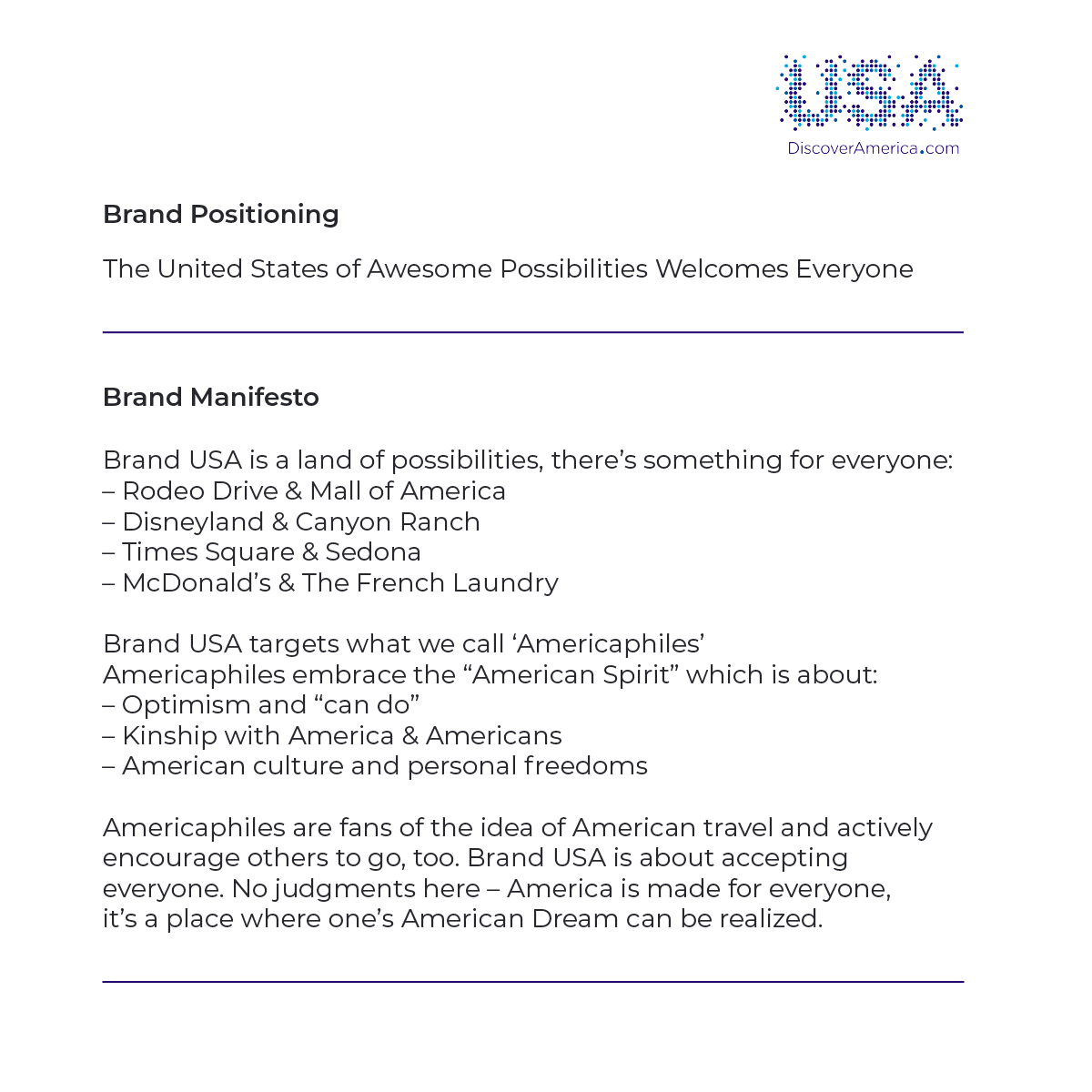 Straightforward as may seem, the United States is known by many names around the world, so we embarked on research consisting of audits of over 100 other countries’ tourism and business programs, and speaking with people from around the world to get a sense of how people speak about and refer to the US. We created “Brand USA” as the entity, and “Discover America” as the tagline/URL.