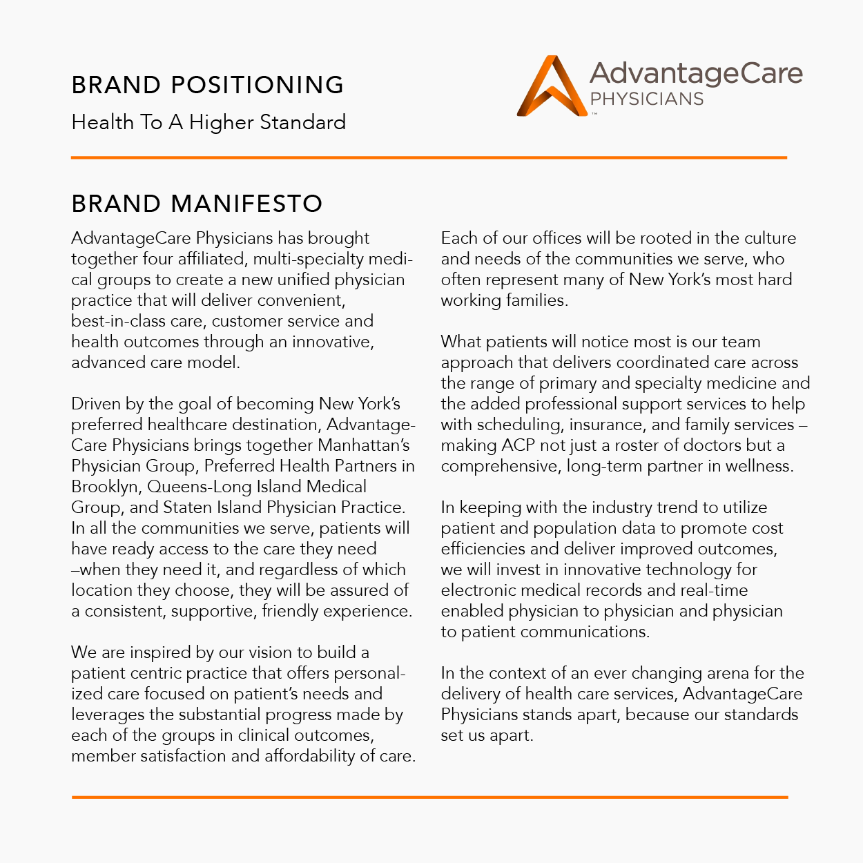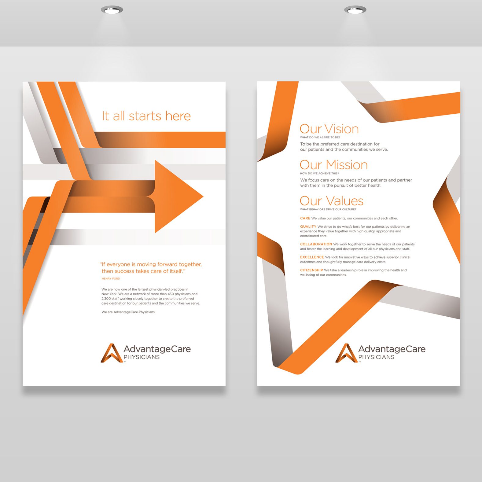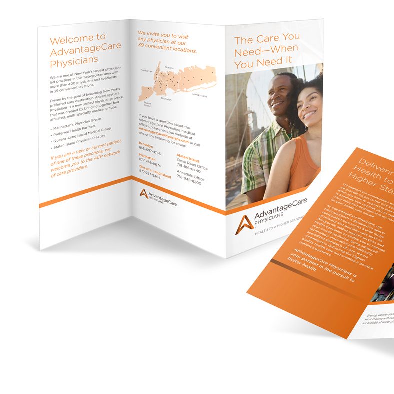 After the positioning and TOV were established, we moved on to the name and identity for the new group. We explored hundreds of name options and dozens of potential designs, finally landing on a name that referenced the groups desire to advance patient care, while simultaneously putting patients’ needs first: AdvantageCare Physicians. The identity utilized a ribbon that became a visual element across all touchpoints, representing the new union and connection between what was once 4 separate groups.
