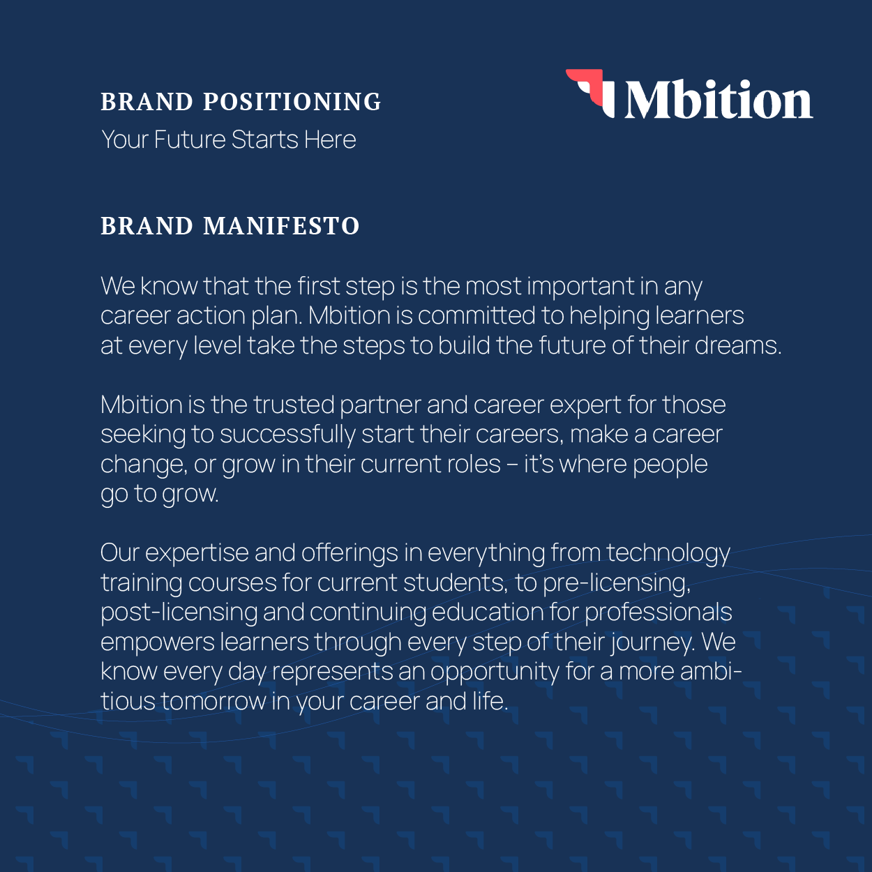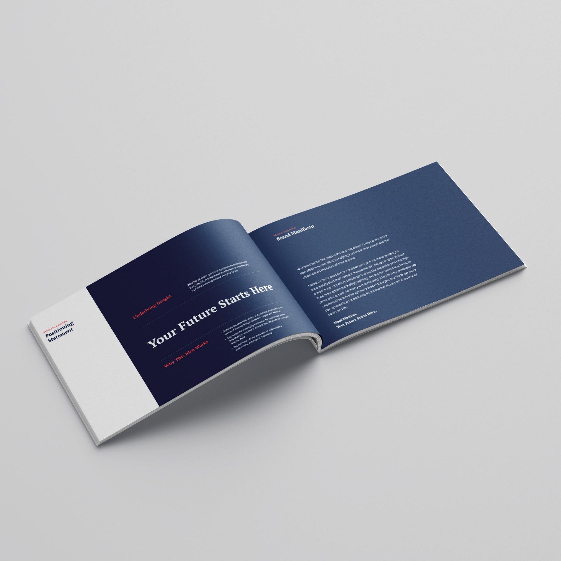 Our Brand Definition exercise explored numerous ideas that coalesced customer needs, the unique qualities of the organization, and differences vs. competitors. We chose the brand positioning idea of ‘Your Future Starts Here’ to denote the idea that career development, and a brighter future would begin with this new brand.