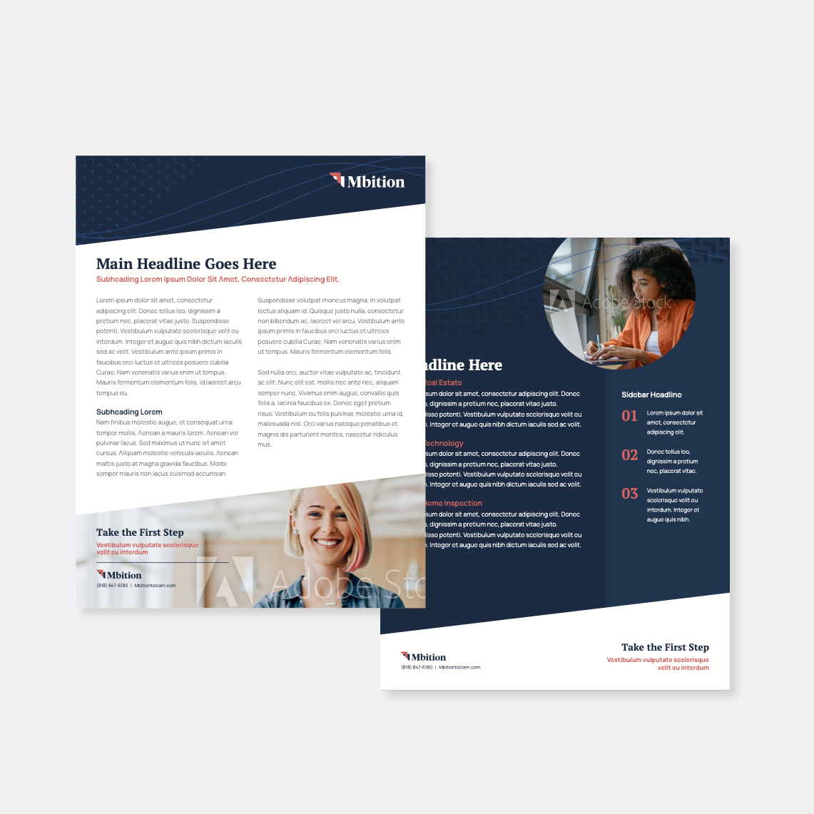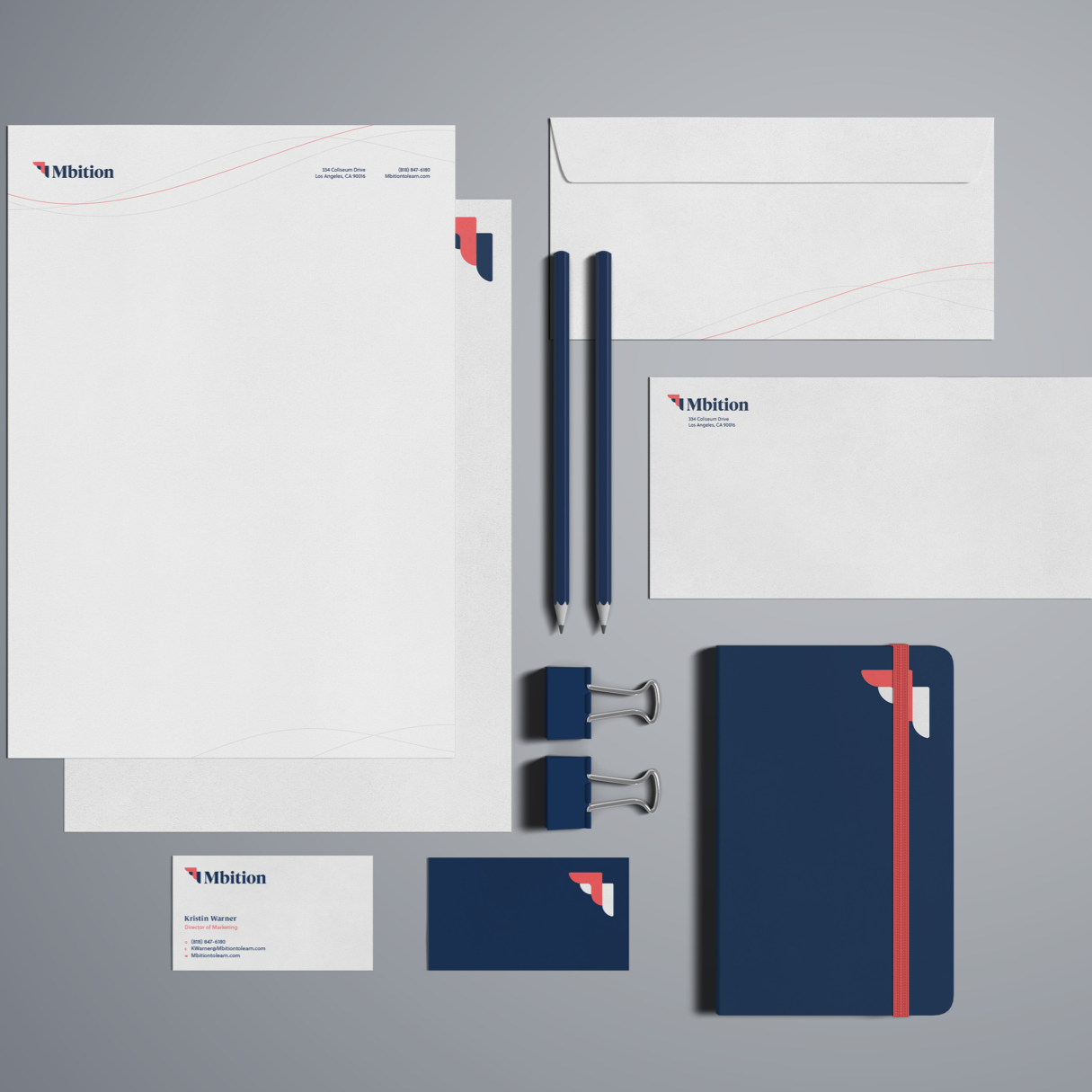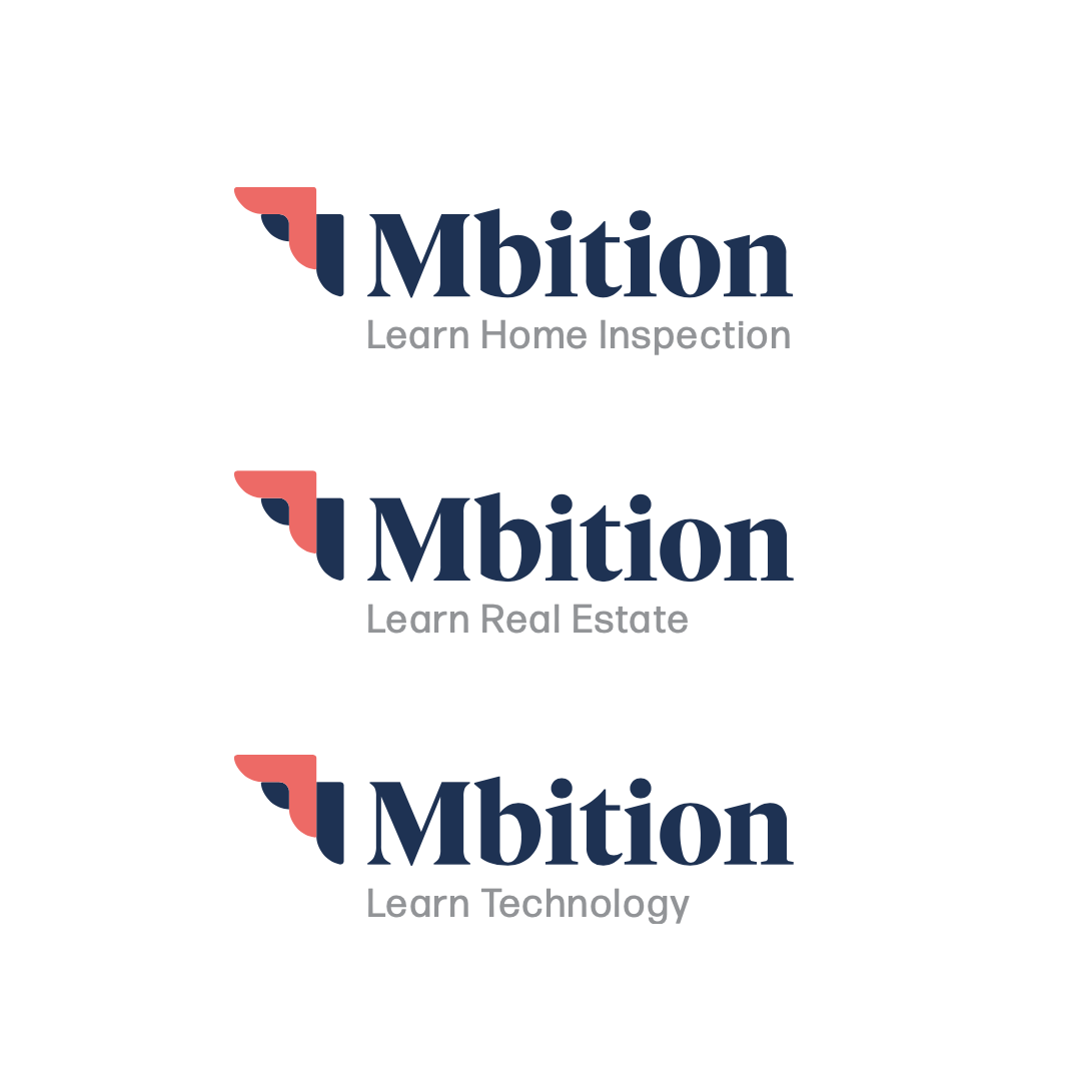 The ‘Future In Flight’ logo we created for Mbition conveys ambition, altitude, and professional growth. Finally, the sub-brand lockups for Mbition Learn Real Estate, Mbition Learn Home Inspection, and Mbition Learn Technology reflect our go-to-market recommendation in a consistent, memorable identity system.