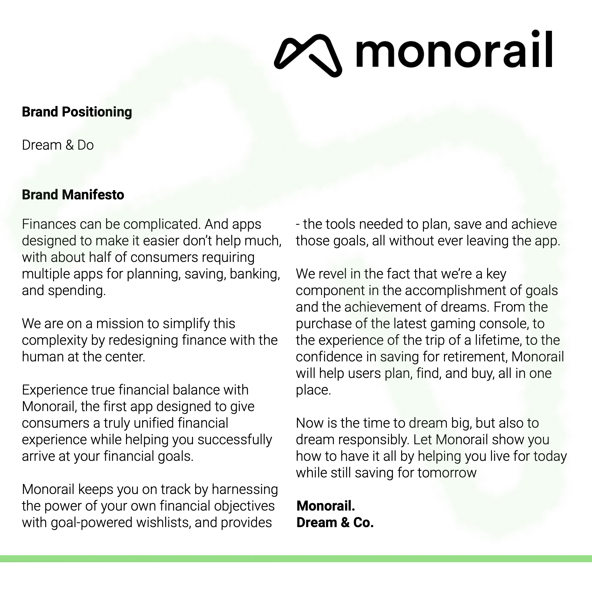 The unique real word idea Monorail was selected because it evokes the idea if a train moving on a single track towards its journey. We helped the team to secure the monorail.com URL too.