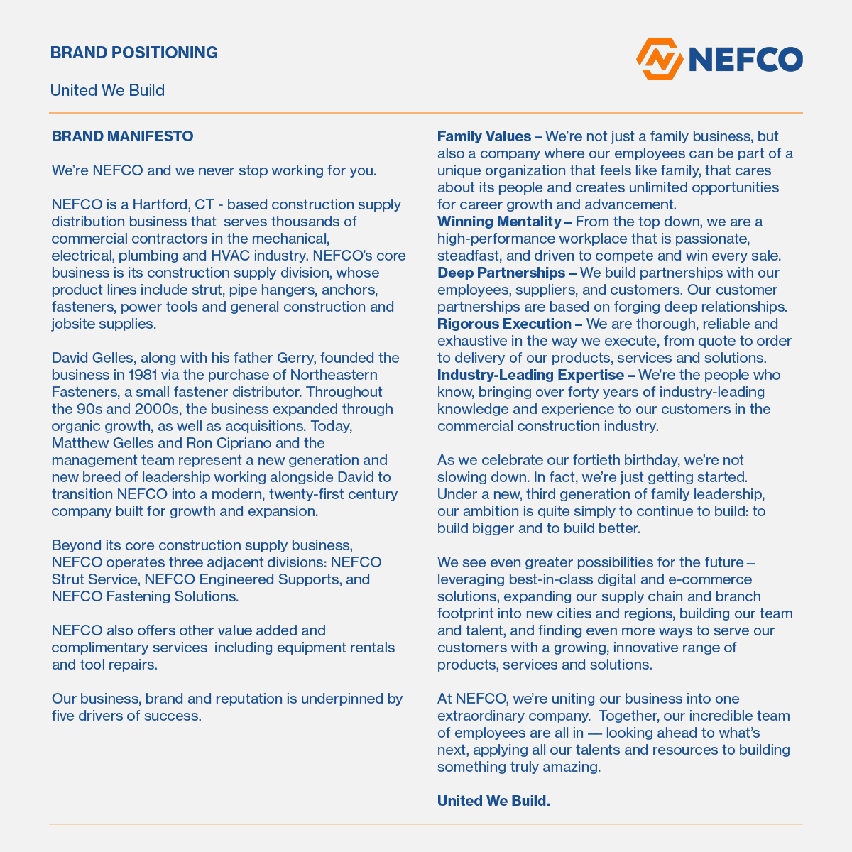 Next, WANT worked with the leadership of NEFCO to reposition the company, choosing the positioning idea of “United We Build” to emphasize the partnership of the branches within NEFCO along with the partnership with their contractor and manufacturer customers.