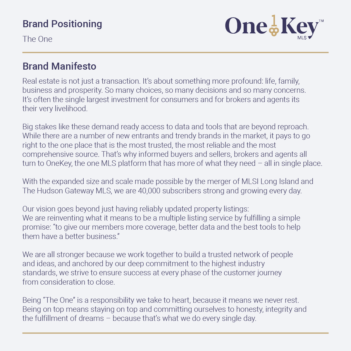 One candidate emerged overwhelmingly from the process – OneKey. For consumers, OneKey underscored MLS as the only source they would need. For realtors, it evoked the idea that this MLS was the number one way to help them succeed. And, for agents, it drove the idea that would unite this cohort and make feel like they were on a winning team that could help make their day to day work life much easier.