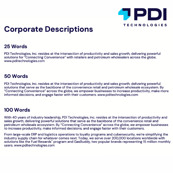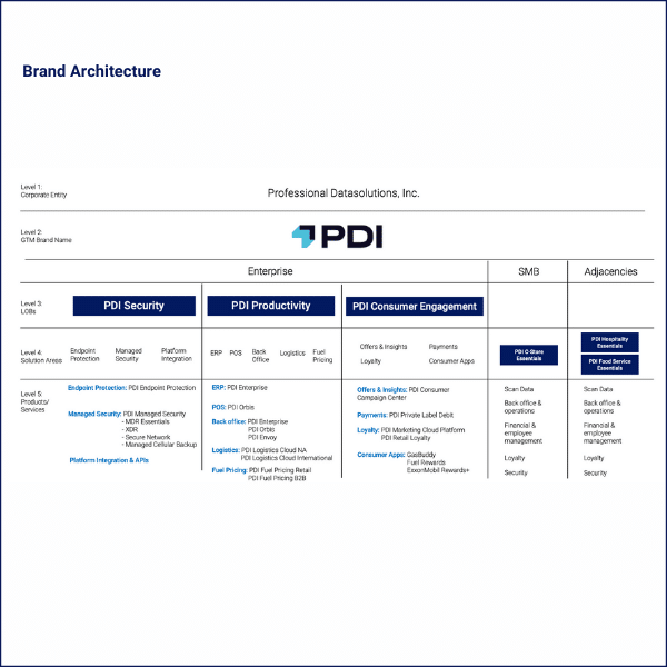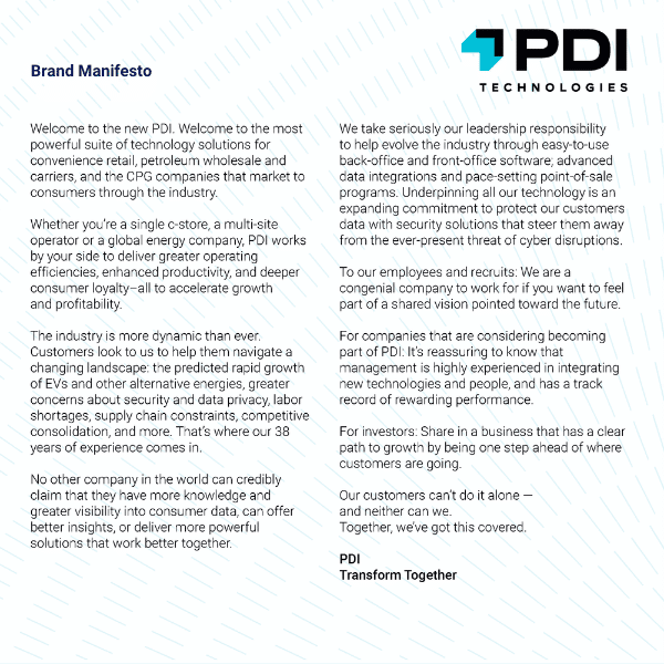 Once that positioning was approved, WANT recommended adding “Technologies” to the company name PDI, to reflect the core competency in solutions for the full range of clients from individual gas stations to regional brands like Circle K all the way to the big oil majors like Chevron and Exxon. A brand architecture alignment was recommended to streamline the go-to-market strategy for products and solutions.
