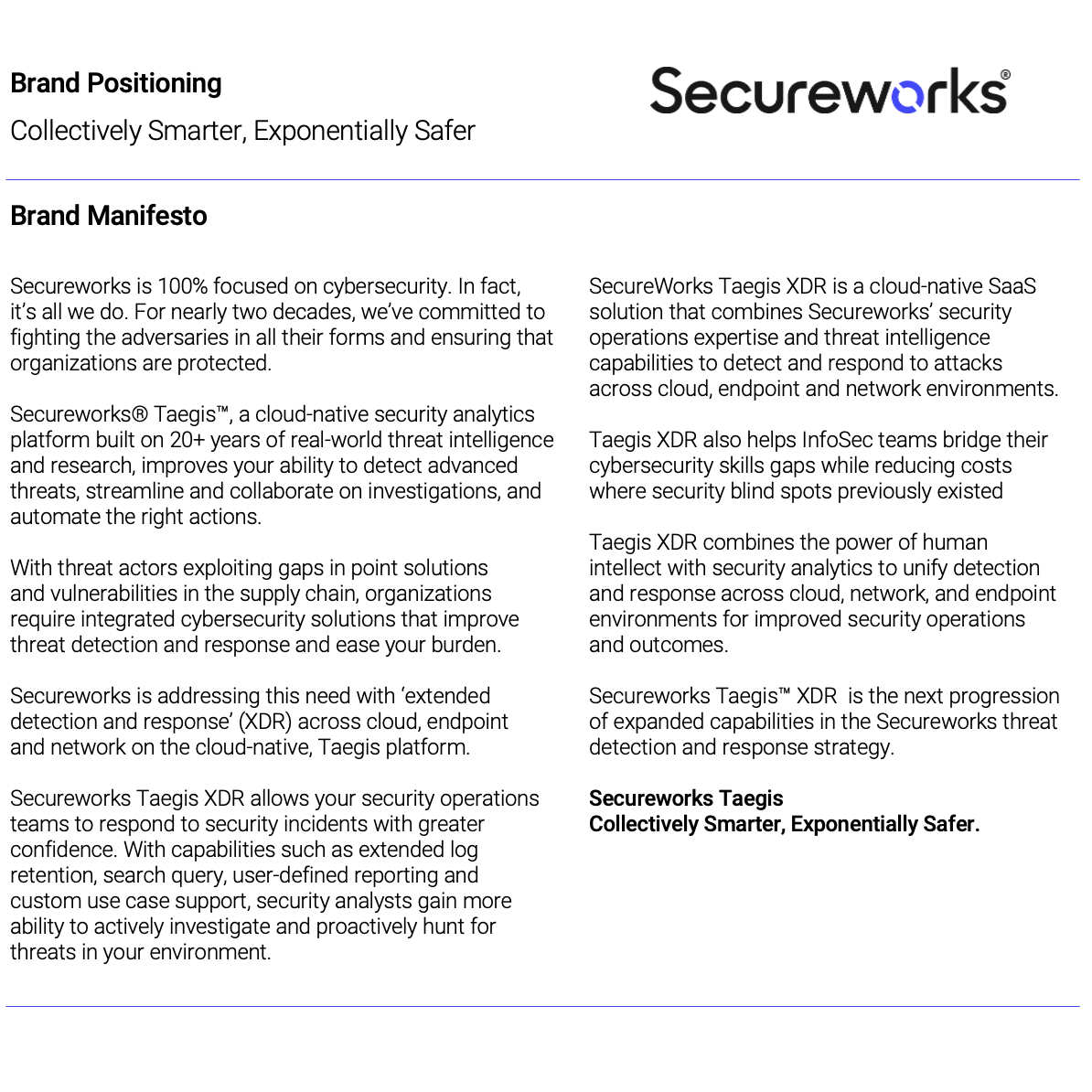 Over a four-month period, WANT Branding worked with the Secureworks marketing team to develop the brand strategy, platform brand name and the brand architecture/naming system. Our work and recommendations were presented one-on-one to all the senior leadership team including the CEO.