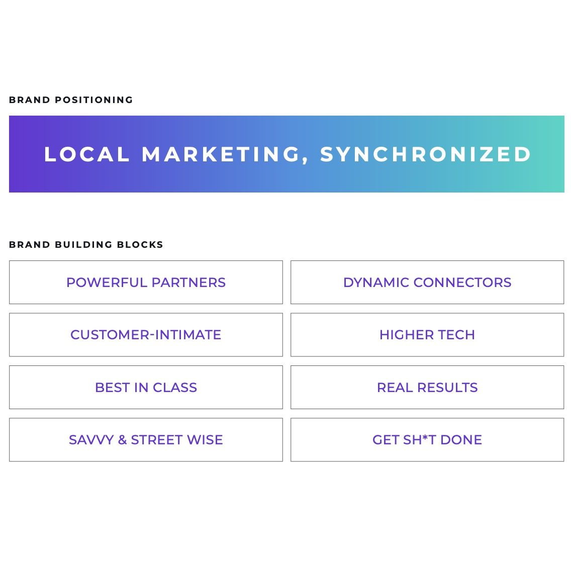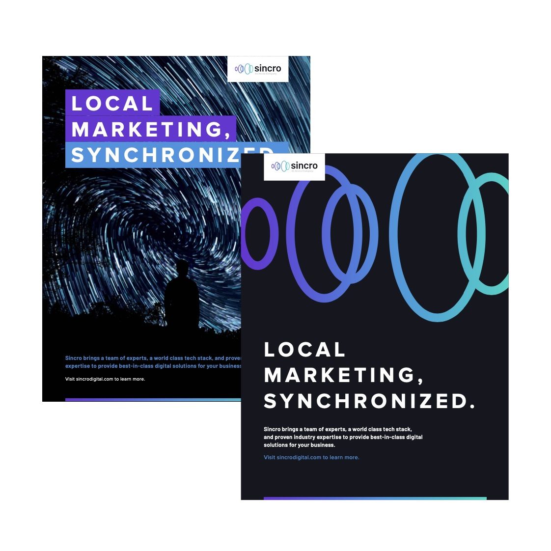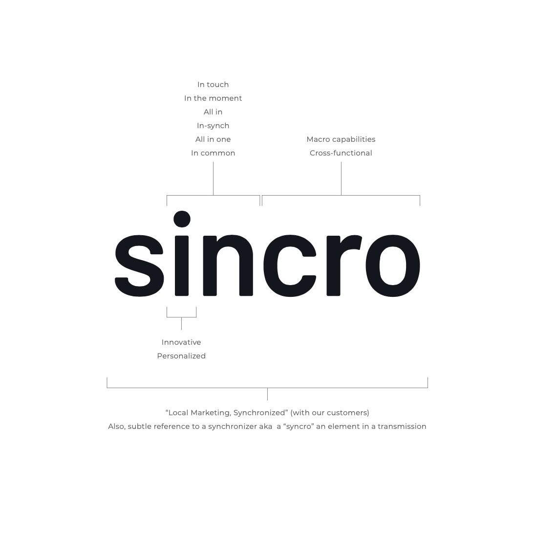 The short, memorable name ‘Sincro’ was chosen for the business. The name alludes to the company’s commitment to in-sync partnership and subtly references a car’s synchronizer (aka synchro) and the company’s automotive roots. WANT created the brand positioning idea ‘Local Marketing, Synchronized’, underscoring the company’s capability and commitment to their partners’ success at the local level. Additionally, WANT to create the branding element ‘We Are The Playmakers’ to express the ability of Sincro’s employees to proactively address their partners needs and to communicate the opportunity to be an immediate playmaker to potential employees.