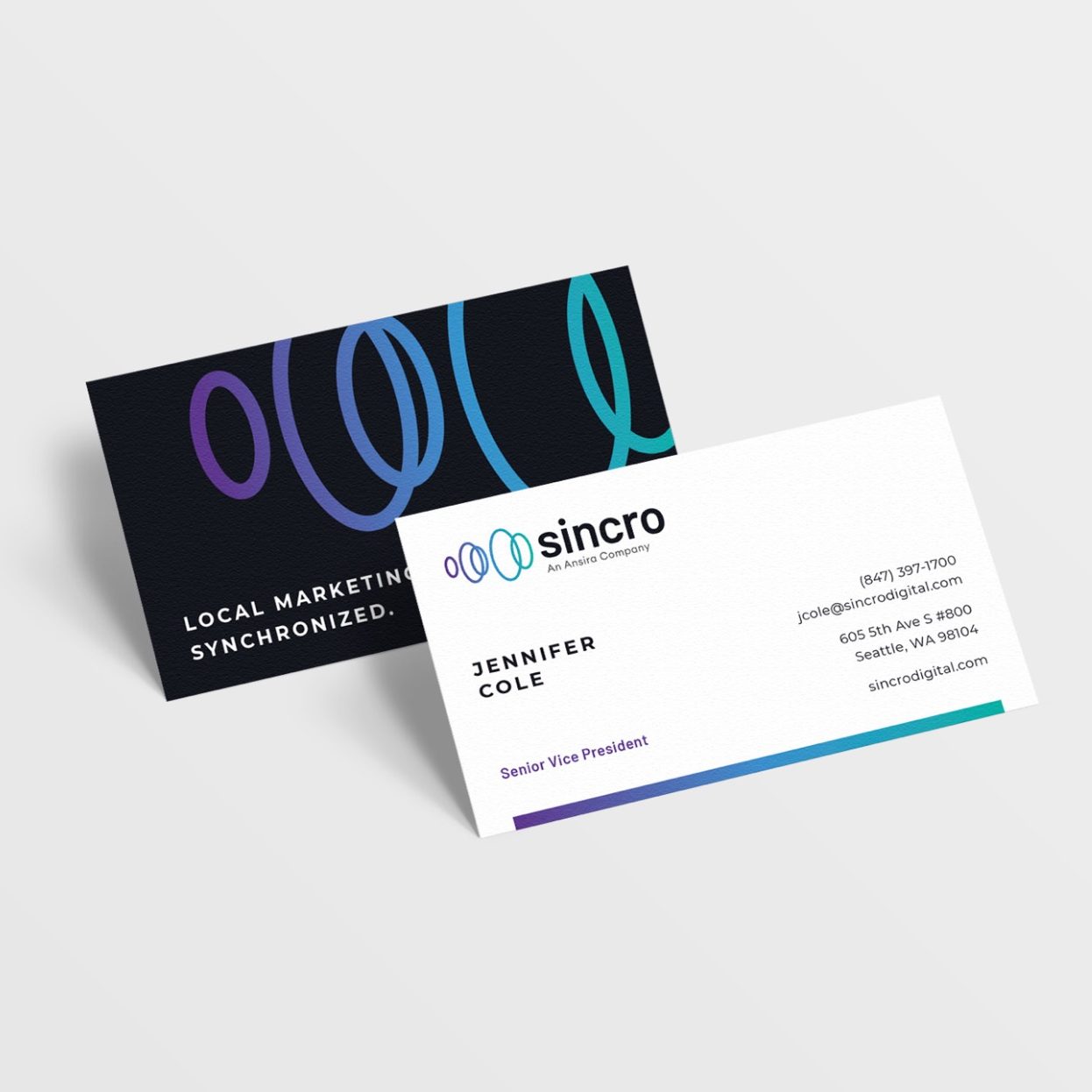The logo we created for Sincro conveys the harmonic partnership the business offers clients and is based on an abstraction of the synchro car part. The strategic decision was reached to lock the logo up with ‘An Ansira Company’ to communicate the acquisition and enhanced offerings it allows while still emphasizing the new brand.