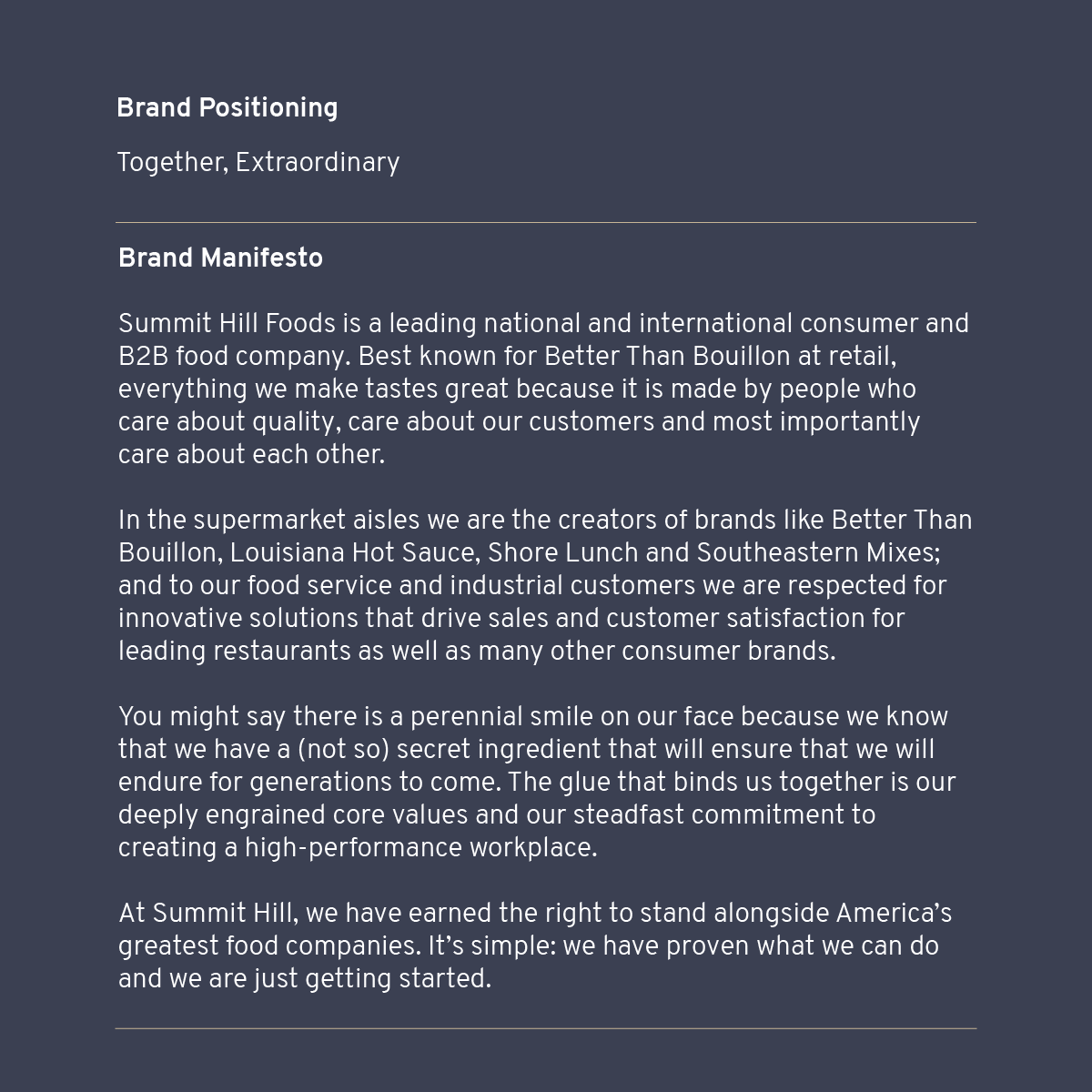 After working our strategic, collaborative naming process, the name Summit Hill was chosen. The name implies the height of quality – along with a subtle reference to the hills of Rome, GA. The brand positioning idea ‘Together, Extraordinary’ was chosen to solidify the importance of partnership and teamwork across their business.